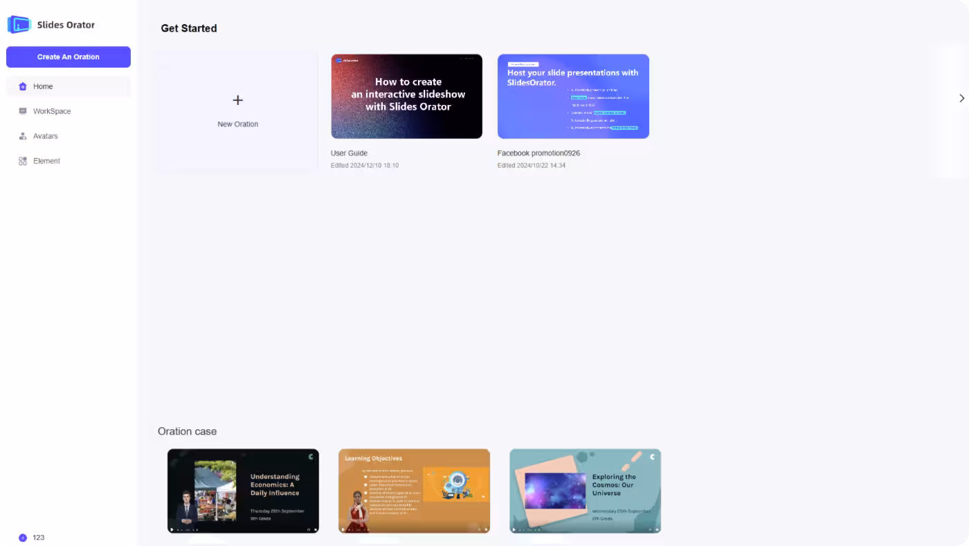 Upload your slides or document, and SlidesOrator will help you generate narration, create a digital assistant, and provide various presentation tools to make your explanation more engaging.