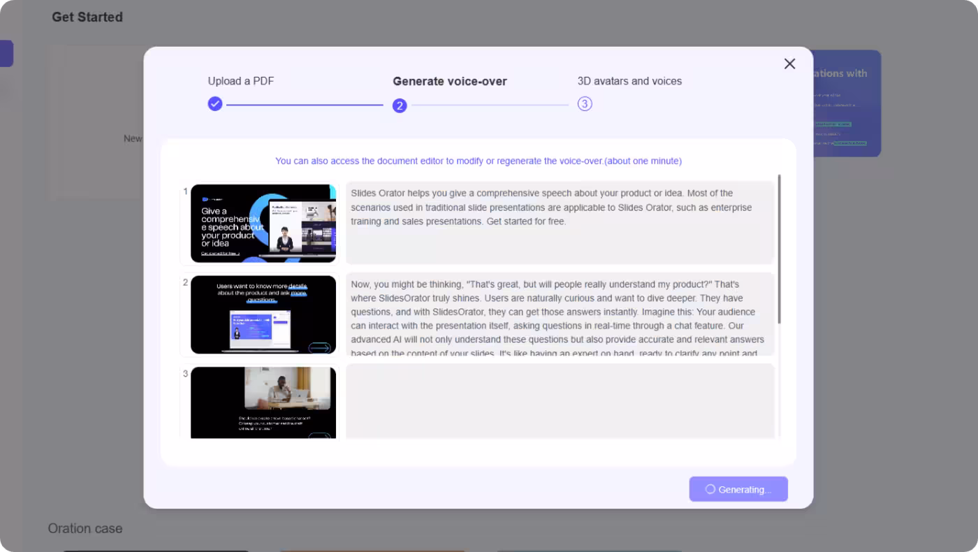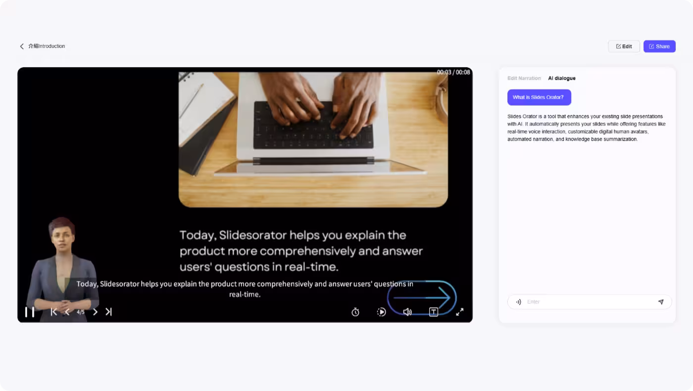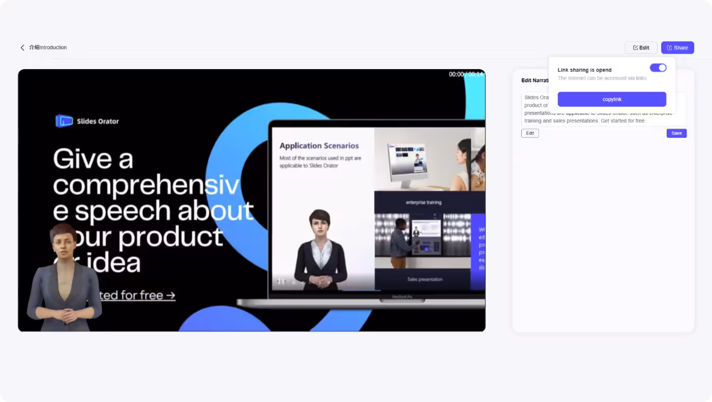 SlidesOrator generates clear and concise narration based on your product content, and you can make adjustments to the narration as needed to ensure accurate communication.